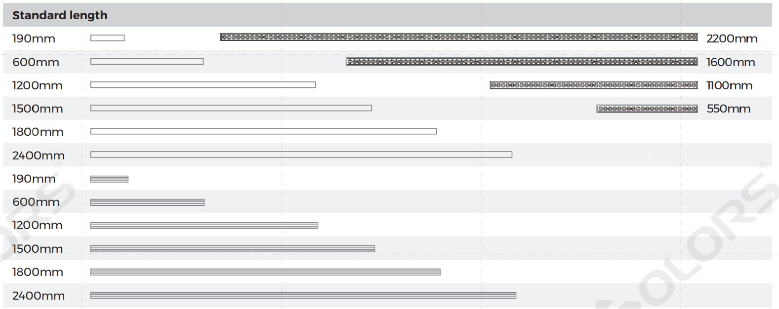 | Pituudet | 200 mm, 600 mm, 1200 mm, 1500 mm, 1800 mm, 2400 mm (muut pyynnöstä) |